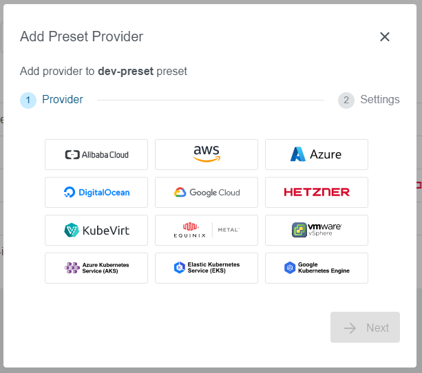 Select a provider you would like to add to the Preset. In our example, we have selected an Openstack provider. Note that every only already configured providers are available on the list.