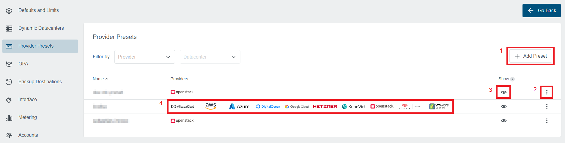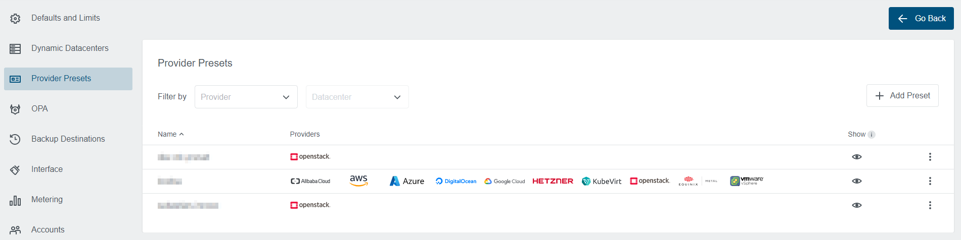 Thankfully, all this can be managed through the Admin Panel in the Kubermatic Dashboard. We’ll shortly describe all the important features and how to use the preset management.