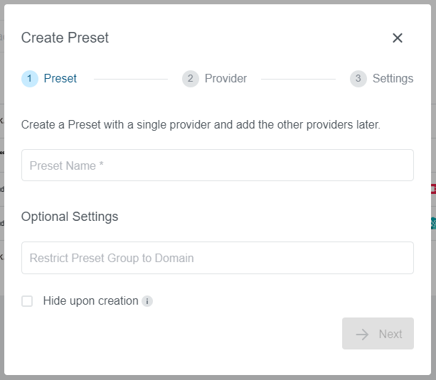 Name is a required parameter and will be used in the wizard to select the providerDomain is an optional parameter that allows to limit Preset availability only to the specific users with email matching this domainHide upon creation allows to hide the preset after creation from the usersAll configured providers will be available on this step and only a single provider can be selected.